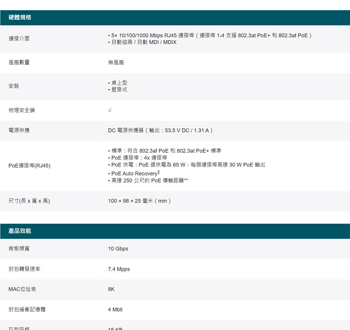 ➤5× 10/100/1000Mbps RJ45 連接埠(4× 符合 802.3at/af 標準 PoE+)