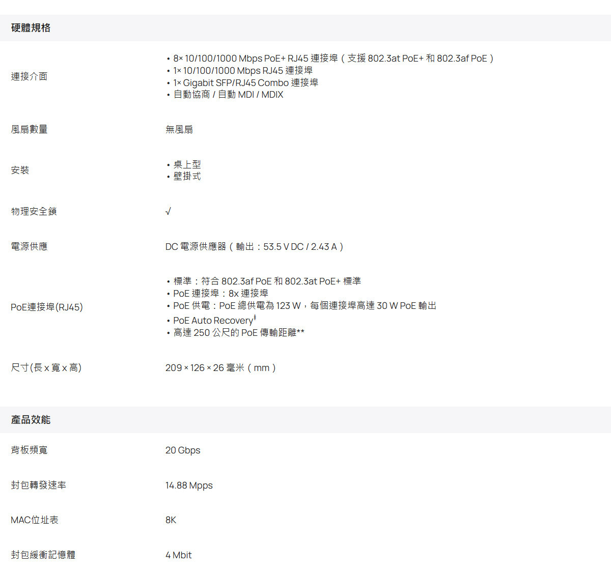 ➤8× 10/100/1000 Mbps PoE+ RJ45 連接埠