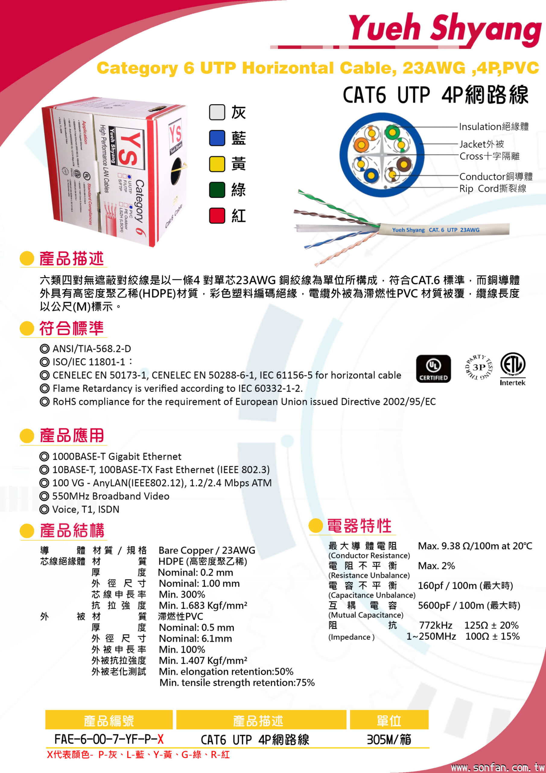 六類四對無遮蔽對絞線是以一條4 對單芯23AWG 銅絞線為單位所構成,符合CAT.6 標準,而銅導體 外具有高密度聚乙稀(HDPE)材質,彩色塑料編碼絕緣,電纜外被為滯燃性PVC 材質被覆,纜線長度 以公尺(M)標示。